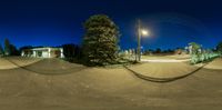 the street is empty and has the lights on and a street light above it,