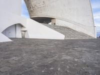 This stock photo features an empty walkway leading to a large white building with steps up to its top, showcasing modern architecture in Spain. The city is filled with contemporary concrete structures and surrounded by the beautiful blue sea. The open space and clear day provide a peaceful atmosphere. The staircase and arch add an interesting design element to the composition. The building is made of composite materials, particularly using cement, and its white color contrasts against the blue sky and the beige limestone surface. This image captures the unique blend of urban and futuristic architecture in Spain, making it a popular tourist attraction. Perfect for vacation and city life-themed projects.