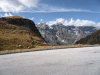 This captivating stock photo depicts an empty, winding road cutting through a breathtaking Austrian mountain landscape. The asphalt surface of the road stands out against the clear sky, allowing for a spectacular packshot image. The picturesque European scenery showcases steep mountains with snow-capped peaks in the distance, creating a sense of vast open space and tranquil nature. The photograph, taken during the day, beautifully captures the essence of the Austrian mountainous region.