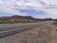 This stock photo shows the yellow lines of an asphalt road running alongside the impressive mountain range in South Africa's highland. The road surface is visible as it snakes through the desert landscape, surrounded by lush vegetation and tall trees. The clear blue sky and fluffy clouds create a picturesque backdrop for this endless road journey.