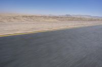 an empty road near a desert landscape with a person riding a bike on it on a clear day
