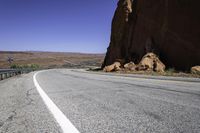 Endless road in the desert of Utah, surrounded by stunning red rock formations. Clear sky and low vegetation accentuate the rugged and untouched landscape. The road's asphalt surface curves gracefully, leading to an endless adventure.