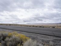 Endless road stretching through the beautiful landscape of Utah, lined with vibrant yellow flowers. The grey sky adds a touch of drama to the scene. A perfect day for a drive in nature.