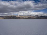 A breathtaking view of the endless Salt Lake in Utah, USA. The photograph showcases the beautiful landscape of the desert with hills in the background, a vast expanse of blue water resembling a loch, and a mountain range in the distance. The sky above is adorned with fluffy clouds, adding to the serene atmosphere of this highland wilderness. This image captures the open space and natural beauty of the mountain landforms, creating a sense of tranquility and awe. The Salt Lake City, famous for its salt industry, is nearby, and the salt surface of the lake shines brightly under the daylight. This picture also evokes the feeling of adventure and exploration, as an endless road stretches across the salt surface, leading towards the Bonneville Speedway, known for its thrilling racing events.