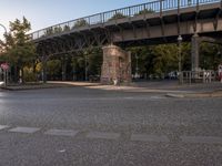 A captivating view of Berlin's urban landscape at dawn. The concrete bridge casts a bold shadow over the road and asphalt, with the sun visible in the clear sky. The vibrant city of Berlin comes alive as the day begins.
