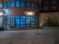 Night in Berlin's urban landscape. Classic architecture and brick walls contrast with artificial light. Cobblestone courtyards and warehouse storage depots create an atmosphere of European city life.