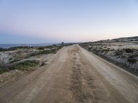 This image captures the scenic coastal landscape of Portugal in Europe. A dirt road extends straight into the horizon, flanked by hills and grassy land lots. The clear sky above contrasts with the serene ocean in the distance. The photo depicts a peaceful dawn or break of day, where the first light illuminates the coastline. The sandy terrain and gravel path add a natural touch to the scene. It's a perfect representation of the beauty of nature and the peacefulness of the coastal regions in Portugal.
