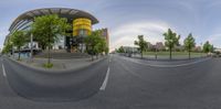 a city with an intersection of road and building with street lights above it in a 360 - fisheye view