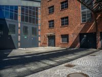 Classic architecture in urban Berlin. Cobblestone streets lead to old warehouses and factories. Hard shadows interplay with vegetation in open spaces. A blend of European charm and urban design in the city.