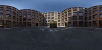 Classic architecture in Berlin's business district. Office buildings and warehouses blend with urban design. Brick walls, open spaces, and vegetation create a dynamic cityscape. The hard shadows cast by the buildings add depth and profile to the scene.