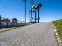 This image captures the industrial landscape of Bremerhaven, Germany. The clear sky provides a backdrop for the container port, with cranes and container stacks lining the pier. The urban design of the city is showcased through the road and asphalt surfaces that lead to the harbor. Alongside the road, there are fences and vegetation, adding to the composite material and grass surroundings. Overhead power lines connect the factories and machines in the area. This photo captures the essence of the industrial and container shipping hub of Bremerhaven, located in Europe.