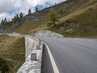 A scenic view of an asphalt road winding through the beautiful landscape of Austria. The road is lined with Armco barriers and guard rails, providing safety in the mountainous terrain. Clouds fill the sky on this sunny day in Europe's nature-filled country.