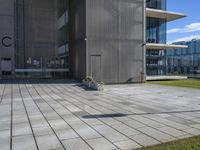 This is an image of a modern architecture building located in Lisbon, Portugal. The building has large windows and a sleek facade, creating a striking urban design. In front of the building is an outdoor square patio with a planter. The patio is surrounded by open space and grass, adding a touch of nature to the city environment. This photo represents a day in the business district of Lisbon, where the grey office buildings contrast with the clear sky. It showcases the urban lifestyle and the fusion of architecture and nature in this European city.