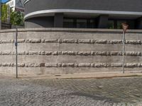 a cobblestone street next to two buildings with street signs on them, on a partly cloudy day