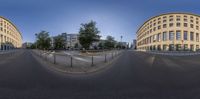 Sunny day in Berlin, showcasing modern architecture in a residential area. Hard shadows create a striking urban design. Clear sky highlights straight roads and city life. Perfect depiction of European urban landscape.