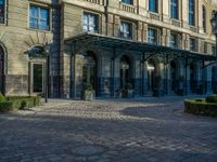 A classic European cityscape in Berlin, Germany. Cobblestone roads and classic architecture create hard shadows under the bright sun. Urban design with open spaces and sunny urban streets.