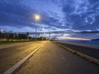 This image captures the beauty of Lisbon, Portugal at dawn. The sky is adorned with clouds, creating a scenic atmosphere. The bridge stands elegantly next to the river, with cars driving on the road surface. The infrastructure, including street lights and underpasses, adds to the architectural charm of the city. The coastline and ocean provide a stunning backdrop to this European landscape. The photo showcases the perfect blend of nature and urban elements, highlighting the unique curb appeal of Lisbon.