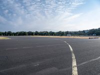 A clear sky overlooks the urban landscape of Berlin, Germany. The asphalted road surfaces and open spaces blend with the city life. The horizon is dotted with trees and vegetation, creating a natural environment in the heart of the city.