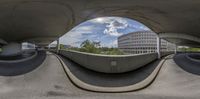 a view of a city from under a bridge with traffic underneath the bridge is shown through the hole