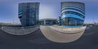 a fish eye lens photo of some office buildings and a skateboard ramp under a clear blue sky
