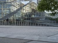 This image captures the modern architecture and urban design of Berlin, Germany. The cityscape showcases the mix of traditional cobblestone streets and contemporary glass and concrete buildings. The open spaces are filled with trees and vegetation, creating a pleasing contrast against the metal and glass facades of the office buildings. The reflection of the surrounding environment can be seen on the glass walls, adding depth to the scene. This photo showcases the vibrant business district of Berlin and highlights its European charm and bustling urban atmosphere.