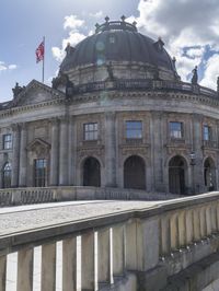 A classic European cityscape in Berlin, Germany. The ornately constructed building with a grand dome stands out against the clear sky. The foreground features a charming cobblestone road and historic architecture including museums and monuments.