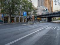Berlin's modern architecture showcased in the early light of dawn. A cityscape with clear skies and urban design, including bridges spanning asphalt roads and underpasses. A glimpse into urban life in Europe.