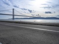 A sunny day in Lisbon, Portugal, with a clear sky and a picturesque coastal road. The cable-stayed bridge connects the city to a jetty on the ocean. The asphalt road surface contrasts with the blue water and the bridge's towering structure.