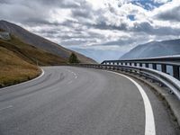 This is an image of a scenic mountain road in Austria, Europe. The asphalt road weaves through the picturesque landscape, surrounded by highland mountains and lush vegetation. The road curves and slopes along the mountain landforms, protected by guard rails and Armco barriers. The clear day allows for a beautiful view of the clouds above. This photo captures the rural charm and natural beauty of Austria's countryside. It represents a peaceful and serene drive through the European countryside.