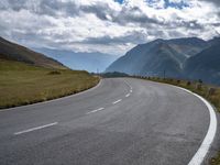 A scenic landscape in Europe, showcasing a winding asphalt road surrounded by lush vegetation and rolling highlands. Majestic mountains tower in the background, as clouds float peacefully across the sky.