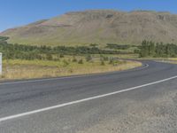 This is an image of an asphalt road winding through the highlands of Iceland. The road surface contrasts with the surrounding terrain, which consists of mountains, rivers, and plains. The clear sky overhead adds to the beauty of the landscape. The vegetation on the slopes is lush and vibrant, enhancing the natural scenery. This photo captures the untouched beauty of Iceland, an island in Europe known for its breathtaking landscapes and natural wonders.