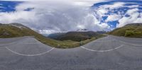 A picturesque mountain road in Austria, with a straight path leading into the open space ahead. The gloomy grey sky reflects in an upside-down mirror image on the asphalt. A serene and captivating European landscape.