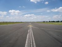 This image shows a clear blue sky with scattered clouds in Berlin, Germany. The straight road surface leads to an open space in the distance, surrounded by fields and trees. The asphalt road cuts through the landscape, providing a thoroughfare for vehicles and creating a sense of movement. The image captures a sunny day in Europe, where people can enjoy nature and recreation in the park. This photo is taken in Tempelhof, Germany, known for its historic airfield turned public park.