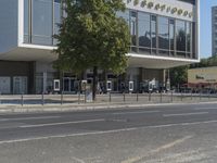 A street view in Berlin, Germany showcasing the city's modern architecture. The multi-story building dominates the scene with a restaurant on the corner. The clear sky adds a touch of European charm.