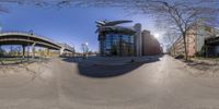 A fish-eye view of a downtown street in Berlin, Germany. The old building in the background adds a touch of history to the modern architecture of the city. The street is lined with trees, showcasing the urban vegetation. A glimpse into the metropolitan charm of Europe.