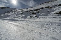 This image captures a man skiing down a snow-covered mountain in the highlands of Europe. The glacial terrain features rocky outcroppings and a dirt road, perfect for off-road adventures. The sunny day illuminates the beautiful landscape of Italy, highlighting the snow-covered slopes and the surrounding nature. The skier can be seen navigating the surface, enjoying the thrill of the ride. This photo represents the perfect winter getaway for outdoor enthusiasts.