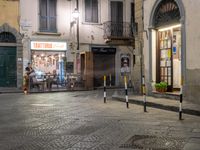 This image captures the charm and beauty of nighttime in Florence, Italy. The road is illuminated by soft artificial light, highlighting the cobblestones. The person walking on the sidewalk adds a touch of liveliness to the serene scene. In the background, a cozy cafe and restaurant nestled amidst a garden create a romantic ambiance. This picture showcases the enchanting atmosphere of one of Europe's most iconic cities. Explore the winding streets and discover hidden gems in this captivating landscape.