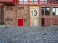 Berlin's urban design at dawn, showcasing modern architecture and brick walls in a residential courtyard. Cobblestone streets lead to storerooms and warehouses. City life emerges in Europe's Hinterhof settings.