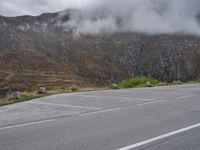An open space landscape in Austria. The road, surrounded by mountains and nature, leads to a parking lot. The gloomy grey sky adds a sense of mystery to the scene.