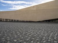 A modern architecture in Lisbon, Portugal, with a symmetrical design. The stone pavement outside forms a rectangular pattern, contrasting with the glass windows. The blue sky and clouds create a stunning backdrop.