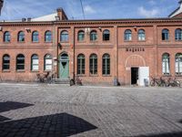Classic architecture in the heart of Berlin, Germany. Brick facades and cobblestone streets add to the charm of this European city. A bustling urban scene with bicycles and a car parked at the top of the buildings.