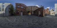 some buildings and rocks are featured in the 360 eye pano shot of the road