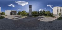 a view of the street through the small fish eye lens image with a clock tower in the background