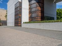 Modern architecture in Berlin, Germany. Clear sky overlooks an open space with concrete walls. The urban landscape blends gravel and sand surfaces with a touch of European flair.