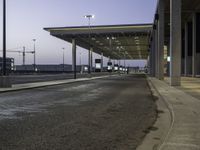 a view of an empty bus stop in the evening time with no people visible and an airport in the background