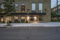 An evening view of a store in Toronto, Canada. The classic architecture of the building stands out against the dark urban backdrop. Street lights illuminate the sidewalk, creating a lively atmosphere in the residential area.