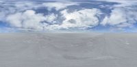 Sunny day over expansive salt flats, resembling a desert. Sun visible through sparse clouds, casting light on this open space. The endless salt landscape stretches under the vast skydome.