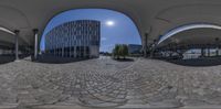 the reflection in the fisheye lens is clearly visible from the circular walkway with a person walking across