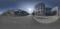 Berlin city life featuring modern architecture in the business district. Clear sky casts hard shadows on asphalt and paver surfaces. Explore the streets of this European urban hub.