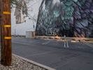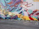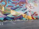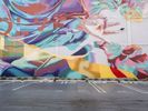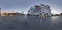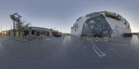Explore the art district of Los Angeles, California at dawn. Multicolored graffiti adorns industrial buildings against a clear sky. Artificial light highlights classic architecture and vibrant street art, capturing the city's urban and creative spirit.